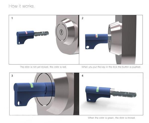 是不是每次鎖上大門鎖時(shí),患有鎖門強(qiáng)迫癥的你總是會(huì)扭下門鎖的把手檢查一下有沒有上鎖?;蛘咦吡艘粫?huì)自問自己到底有沒有鎖門,甚至跑回來再次檢查門鎖是否上鎖。2012詹姆斯戴森設(shè)計(jì)大賽上,這款大門鎖為廣大患有鎖門強(qiáng)迫癥的人帶來了福音。大門鎖的巧妙之處在于鑰匙上,鑰匙后面有一個(gè)小小的指示燈。指示燈綠色,表明門還沒有鎖好。指示燈紅色,表明門已經(jīng)安全上鎖。小小一個(gè)創(chuàng)意,是不是以后鎖門時(shí)心里安全多了。