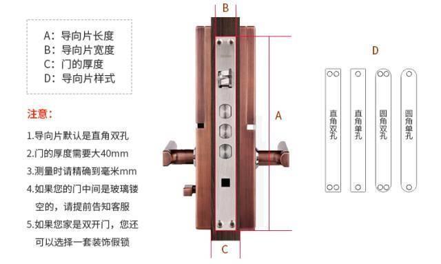 舊鎖換新需要提供的數(shù)據(jù):門的厚度、導(dǎo)向片的長*寬、鎖體襯板的長*寬、鎖體襯板上下、左右固定螺絲的距離、舊門鎖面板的尺寸。舊鎖換新是比較麻煩的,以上這些數(shù)據(jù)一定要有,不然購買智能鎖回去之后,不合適還需要重新退換貨。