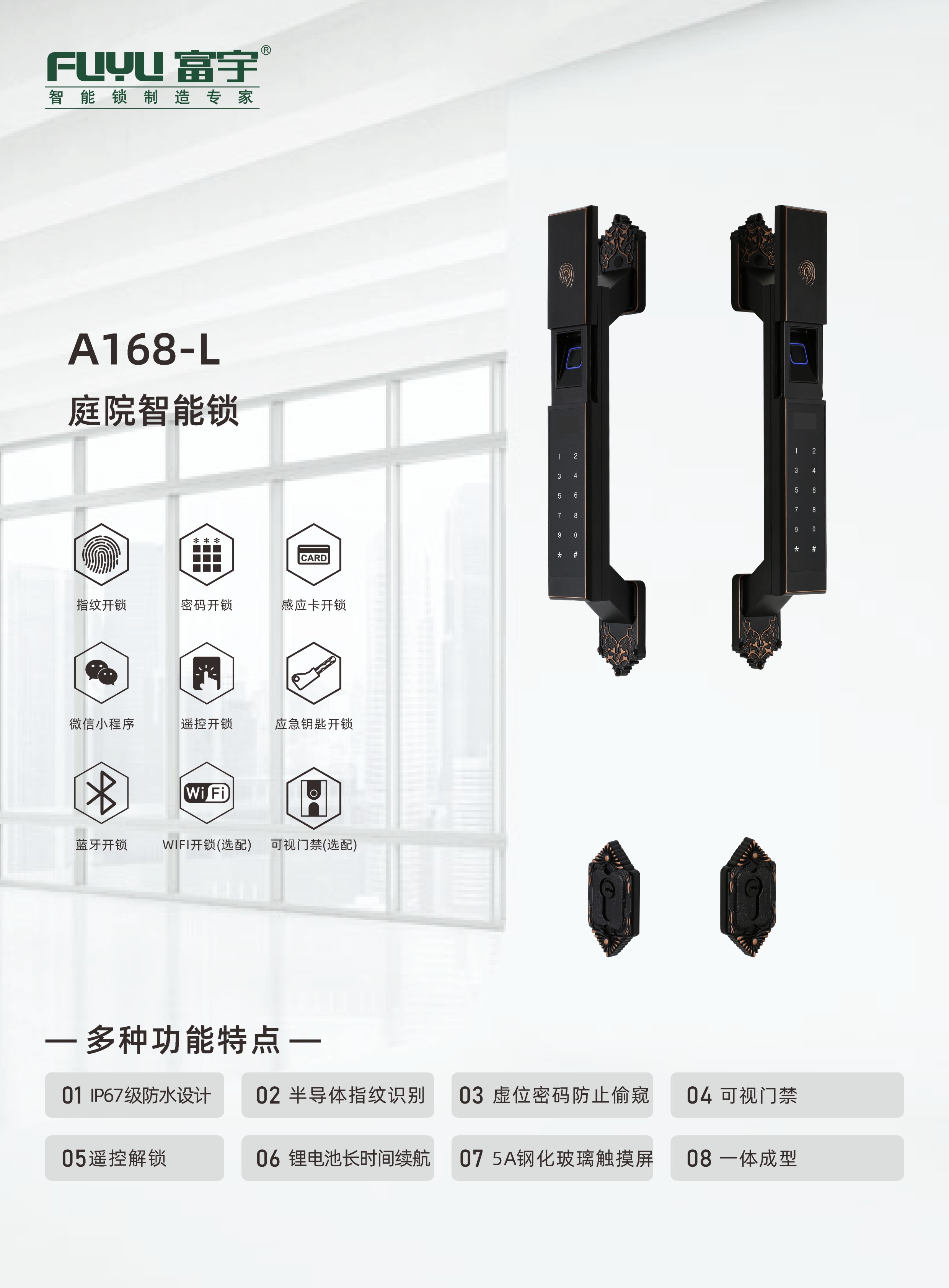安裝考慮因素:在選擇戶外庭院智能鎖時,需要考慮鎖體的耐候性、電池壽命、與現有門體的兼容性等因素。此外,考慮到戶外環境的多變性,鎖體的防水防塵性能也非常關鍵。 戶外庭院智能鎖以其方便性、安全性和智能化管理的優勢,成為現代家庭的理想選擇。在選購時,消費者應全面考慮產品的性能和適用性,確保所選智能鎖能夠滿足自家庭院的需求。安裝后,適當的使用和維護是保證智能鎖長期穩定工作的關鍵。