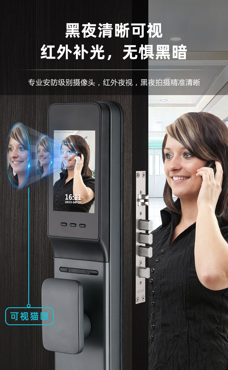 在這個五一假期,讓我們來談談如何通過高科技提升家居安全。我們的智能鎖配備了4.0寸100萬像素的高清可視貓眼,采用150度的大廣角鏡頭,確保門外的每一個角落都無死角地被捕捉。無論是白天還是夜晚,雙紅外補光技術都能提供清晰的圖像,讓您即使在視線不佳的情況下也能清楚地看到門外的一切。