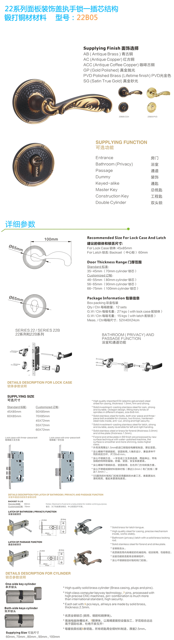 * 優質全銅鎖芯,標配5條全銅鑰匙