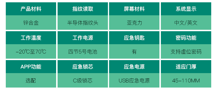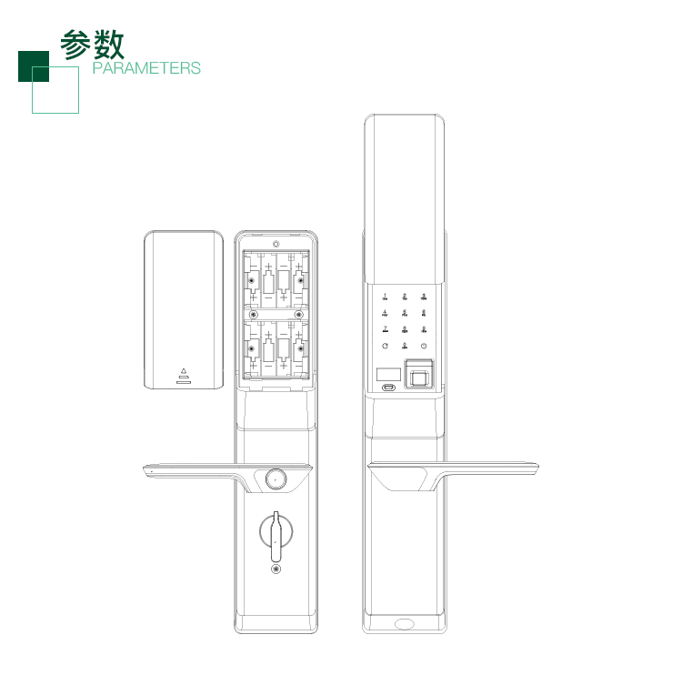主要材質(zhì):鋅合金 指紋容量:管理員3枚,普通用戶97枚 密碼容量:管理員3組,普通用戶7組 感應卡:管理員3張,普通用戶47張 工作溫度:-25℃到65℃ 工作電源:4節(jié)1.5VAA堿性電池 反應時間:≤0.5s 適用門類:木門/不銹鋼門/鐵門/銅門 可配鎖體:6052鎖體 可選顏色:紅古銅/迪拜金/魅藍/美國黑