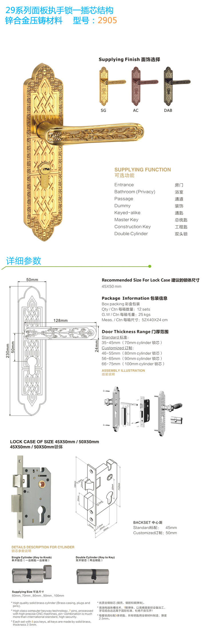 * 優質全銅鎖芯,標配5條全銅鑰匙