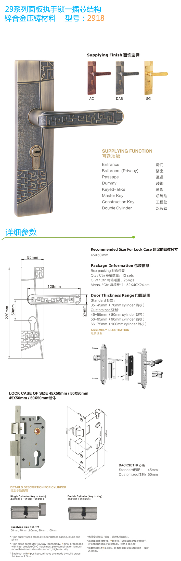 * 優質全銅鎖芯,標配5條全銅鑰匙