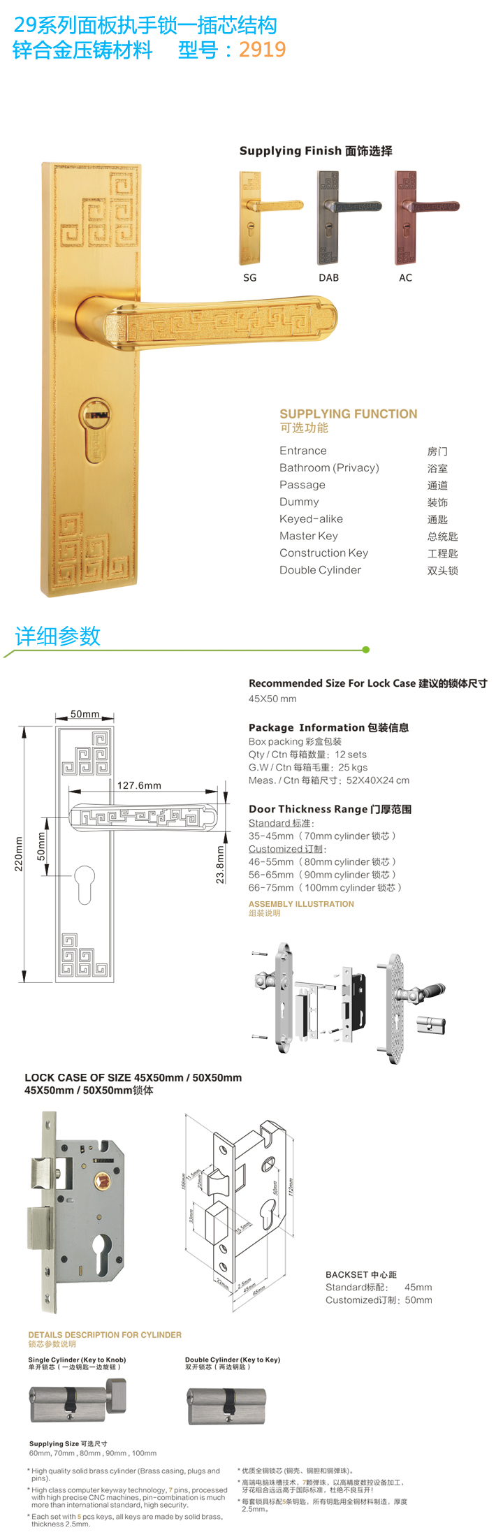 * 優質全銅鎖芯,標配5條全銅鑰匙