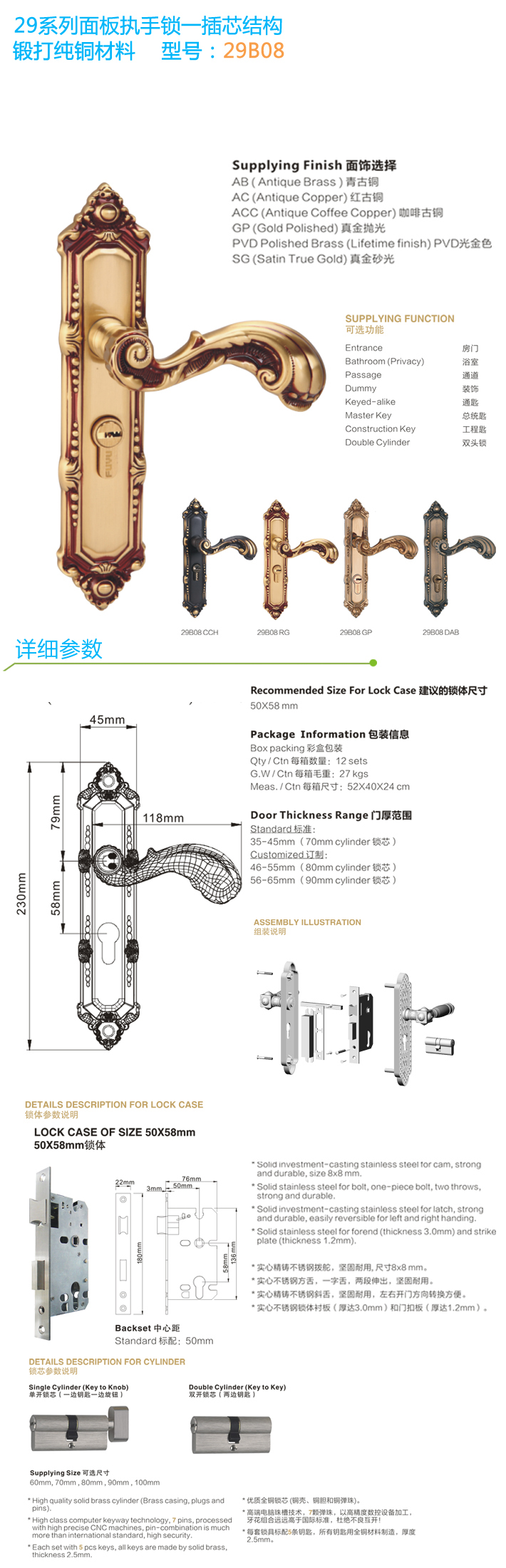 * 優質全銅鎖芯,標配5條全銅鑰匙
