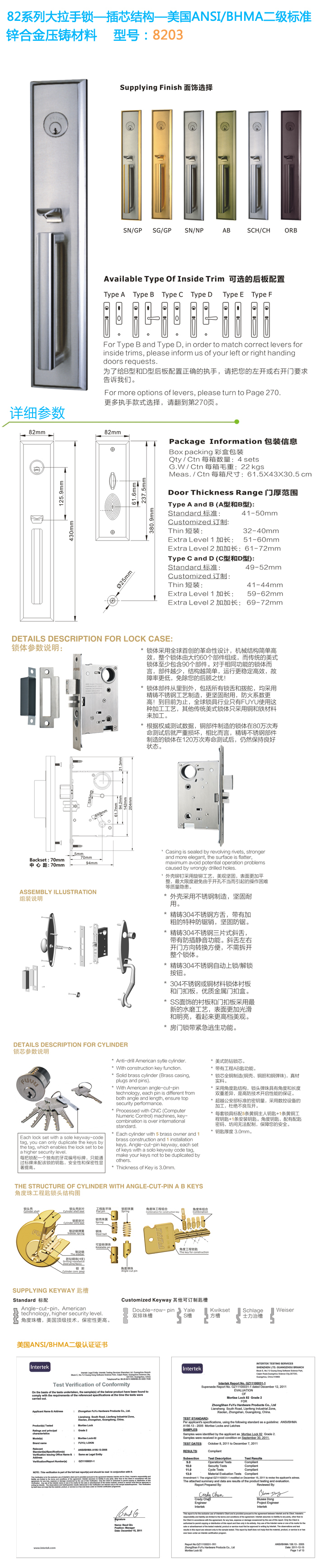 - * 通過(guò)美國(guó)ANSI/BHMA GRADE二級(jí)認(rèn)證