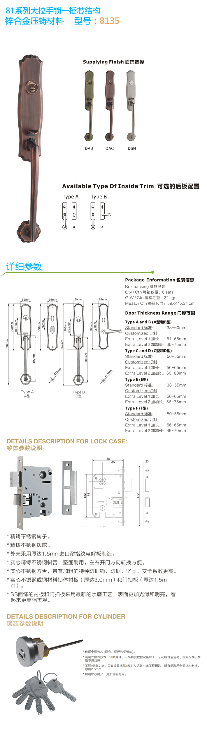 * 鎖體采用精鑄不銹鋼斜舌、防鋸方舌、轉子和拔舵