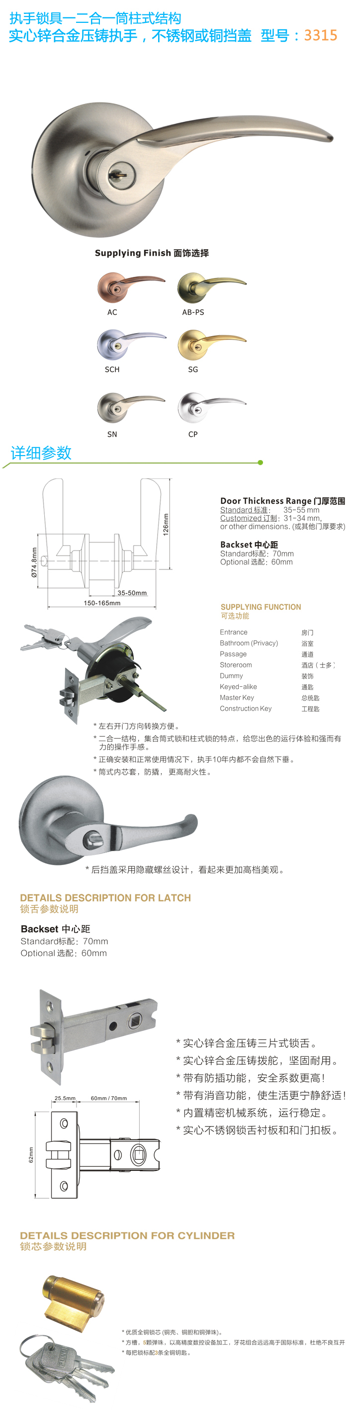 * 表示必填采購:筒柱式二合一結(jié)構(gòu)執(zhí)手鎖 3315